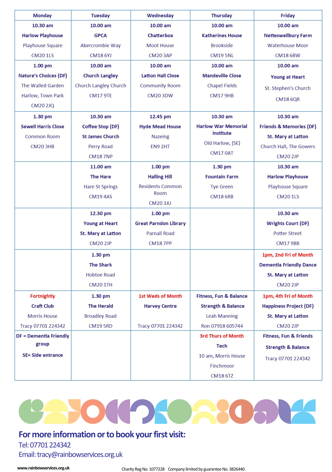 For more information about any of our regular clubs please contact Jenny 07849 087789 Jenny@rainbowservices.org.uk